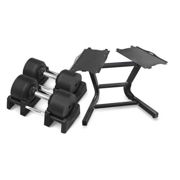 Vårt största justerbara hantelpaket, komplett med hantelställ! Idealiskt för hemgymmet där ambitionen är att lyfta och pressa tungt! Hantelpaketet innehåller 1 par av våra revolutionerande hantlar samt ett robust hanteställ för att underlätta träningen! Komplettera med en träningsbänk och ta era resultat och hemträning till nästa nivå!- 1 par justerbara hantlar, ställbara i 26 st viktnivåer mellan 4 – 41.5 kg!- Vikten justeras med ett enkelt vrid på handtaget- Robust hantelställ ingår för optimal ergonomi under träningspassen