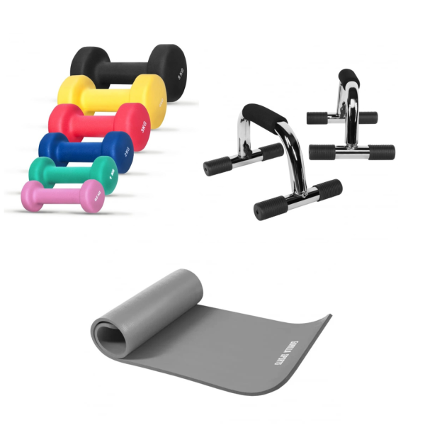 Hemmaträningspaket – Litet Det här hemmaträningspaketet är perfekt för dig som vill komma igång med träningen hemma utan att ta upp för mycket plats. Paketet innehåller allt du behöver för en bra träning – en träningsmatta, push-up bars och hantlar i valfria vikter. Välj själv vilken färg på mattan du vill ha samt vilken vikt på hantleparet. Paketet innehåller; Träningsmatta Deluxe Yogamatta 190x60cm; En skön och mjuk matta som ger bra stöd vid yoga, pilates eller annan rörlighetsträning. Den är 1,5 cm tjock och kommer med en bärsele för enkel förvaring och transport. Push Up Bars; Stabilt handtag som gör armhävningarna lite tuffare och skonsammare för handlederna. Perfekta för att träna armar, bröst och axlar. Vinylhantlar; Smidiga hantlar som finns i vikterna 1kg, 2kg, 3kg och 5kg. Perfekta för funktionell träning, pilates och aerobics. De har en vinylbeläggning som ger bra grepp och skyddar golvet. Träningsmattan; Material; Ftalatfritt, hudvänligt skum av nitrilgummi och PVC Mått; 190x60x1,5cm Inkluderar bärsele Vikt; 1,2kg Push Up Bars; Maximal belastning; 150kg vardera Mått(LxBxH); 27×17,5x13cm Gräppyta längd; 10cm Materialets tjocklek; 1mm Färg; Krom och svart Material; Stål Säljs i par Vinylhantlar; Hantelparen finns i vikterna; 1kg, 3kg och 5kg Material; Kärna gjord av gjutjärn med vinylhölje Färg; 1kg – Grön, 3kg – Röd, 5kg – Svart Säljs parvis Det här paketet ger dig allt du behöver för att komma igång med träningen hemma – oavsett om du är nybörjare eller tränar mer regelbundet.
