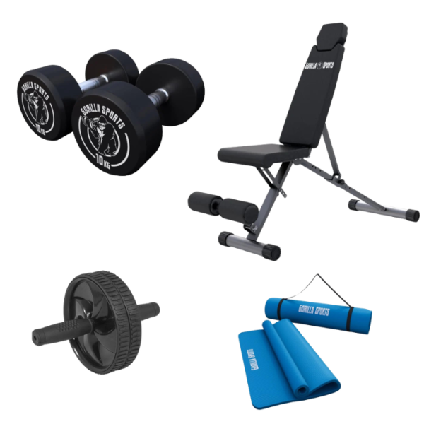 Hemmagympaketet – Nybörjare Med det här paketet får du allt du behöver för att komma igång med styrka, magträning och rörlighet hemma! Den hopfällbara träningsbänken erbjuder stabilitet och komfort för en rad olika övningar, från bänkpress och axelövningar till funktionell träning. De robusta gummihantlarna gör det möjligt att träna både stora och små muskelgrupper med olika vinklar, samtidigt som det räfflade handtaget och gummits dämpning skyddar golvet och minimerar buller. Den tjocka deluxe-träningsmattan ger stöd och komfort för yoga, pilates, stretching eller andra golvövningar. För den som vill utmana magmusklerna ingår ett Ab Wheel med medföljande matta som gör mag- och överkroppsträning effektiv och bekväm. Paketet innehåller; Träningsbänk 200 Hopfällbar Ställbar – Hopfällbar bänk med justerbart ryggstöd från ca 90 grader till negativ lutning och maximal belastning på 200kg. Lätt att fälla ihop och förvara utan att ta onödig plats. Hantlar GS Gummi 2x10kg – Gjutjärnshantlar med räfflat handtag och stryktåligt gummi. Perfekt för styrke-, konditions- och funktionell träning med stabilisering av småmuskulaturen. Träningsmatta Deluxe Yogamatta 190x60cm – Tjock och mjuk matta som ger komfort och stöd vid yoga, pilates, stretching och annan rörlighetsträning. Inkluderar bärsele. Ab Wheel Träningshjul inkl matta – Maghjul med dubbla hjul och gummigrepp för stabilitet och komfort. Ingår matta som skyddar knän och ökar träningskomforten. Träningsbänk 200 Hopfällbar Ställbar Mått hopfälld (LxBxH); 84x46x23,5cm Mått totalt (LxBxH); 145x46x120cm Mått sittdyna (LxBxH); 36×33,5x5cm Mått ryggdyna (LxBxH); 81x30x5cm Höjd sittdyna från golv; 44,5cm Material stomme; Massivt stål Material dyna; Skum, PU-läder Maximal belastning; 200kg Sittdyna justerbar; 4-vägs Ryggdyna justerbar; 8-vägs Två låsstift och en låsskruv Vikt; 12,6kg Hantlar GS Gummi 2x10kg Hantelns totala längd; 27cm Viktens diameter; 14,5cm Viktens bredd; 2x6cm Handtag diameter; 2,6cm Handtag längd; 15cm Säljs i par om 2x10kg Träningsmatta Deluxe Yogamatta 190x60cm Material; Ftalatfritt, hudvänligt skum av nitrilgummi och PVC Finns i 13 olika färger Mått; 190x60x1,5cm Inkluderar bärsele Vikt; 1,2kg Ab Wheel Träningshjul inkl matta Färg; Svart hjul och blå matta Maximal belastning; 200kg Mått matta (LxB); 34x17cm Mått hjul (LxB); 27x18cm Diameter hjul; 18cm Inkl. träningsmatta Vikt; 650g Det här hemmagympaketet är perfekt för dig som vill komma igång med styrka, core och rörlighet hemma, på ett säkert och effektivt sätt!