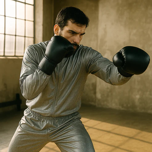 Svettdräkt Bastudräkt Movit Movit's svettdräkt håller din kroppstemperatur uppe under träningen vilket gör att du svettas, ibland så vill man svettas extra mycket för att tappa vattenvikt. Till exempel vid vägning inför professionella boxningsmatcher. Det går även att bära svettdräkten om man vill utmana sig själv för att se hur länge man orkar bära den under passet. Kom ihåg att drick ordentligt med vatten och fyll på med elektrolyter! Övrig information; Elastisk mudd vid höft, handled och fotled Material; högkvalitativt miljövänligt PVC Storlek; Onesize Fri från ftalater Färg; Silver Tvådelat set Jacka; Midjemått cirka; 65cm, töjbart upp till 110cm Krage cirka 16cm bred, töjbart upp till 36cm Armlängd cirka; 60cm Bröstmått cirka; 138cm Byxa; Midjemått cirka; 33cm, töjbart upp till 55cm Benlängd cirka; 110cm Benvidd cirka; 62cm Om du vill tappa vätskevikt inför en boxningsmatch eller bara om du vill utmana dig själv så är Movits svettdräkt den perfekta svettdräkten!