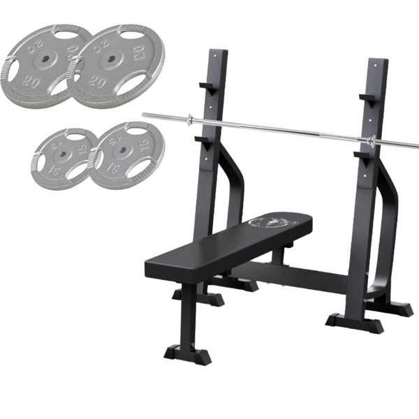 Bänkpresspaket Pro 80kg I det här paketet har vi samlat allt du behöver för att kunna träna tung och säker bänkpress hemma! Med den stabila Bänkpress PRO får jag en träningsbänk med integrerad skivstångsställning som är byggd för att klara tunga lyft. Bänken har en slitstark dyna och hög maxbelastning, vilket gör att jag kan utvecklas över tid. Den medföljande skivstången på 170cm med stjärnlås är anpassad för viktskivor med 31mm håldiameter och ger mig ett säkert och bekvämt grepp under träningen. Med trigrip-viktskivor i gjutjärn på totalt 70kg kan jag både belasta stången för klassisk bänkpress och använda dem separat för funktionella övningar. Totalt blir vikten på stång och viktskivor 80kg, vilket gör detta paket perfekt för dig som vill bygga styrka och få en komplett lösning för bänkpress i hemmagymmet. Paketet innehåller; Bänkpress PRO Träningsbänk 350kg – Robust träningsbänk med skivstångsställning som klarar upp till 250kg belastning på bänken och 200kg på ställningen. Dynan är 120cm lång och 27,5cm bred för stabil träning. Skivstång 170cm Stjärnlås 30mm – Skivstång med 30mm diameter och 128cm grepplängd. Inkluderar två stjärnlås för säker träning och klarar en maxbelastning på 200kg. Viktskivor TRIGRIP Gjutjärn 2x20kg + 2x15kg – Gjutjärnsvikter med trigrip-handtag och pulverlackerad yta i grå färg. Passar alla skivstänger med 30mm diameter. Bänkpress PRO Träningsbänk 350kg Maximal belastning skivstångsställning; 200kg Skivstångsställningens yttre mått; 101cm Skivstångsställningens inre mått; 81cm Avstånd från golv till nedre hylla; 80cm Avstånd från golv till övre hylla; 108cm Mått dyna (LxBxH); 120×27,5×7,5cm Maximal belastning bänk; 250kg Mått(LxBxH); 130x120x140cm Vikt; 40kg Skivstång 170cm Stjärnlås 30mm Passar viktskivor med håldiameter på 31mm Viktområde på varje sida; 20cm Maximal belastning; 200kg Inkluderar två stjärnlås Grepplängd; 128cm Diameter; 30mm Vikt; 10kg Viktskivor TRIGRIP Gjutjärn 2x20kg + 2x15kg Mått 20kg; Diameter 36,5cm, bredd 3,7cm Mått 15kg; Diameter 33cm, bredd 3,9cm Viktskivornas håldiameter; 31mm Material; Pulverlackerat gjutjärn Färg; Silvergrå Det här bänkpresspaketet är perfekt för dig som vill bygga styrka och få en komplett lösning för effektiv träning hemma!