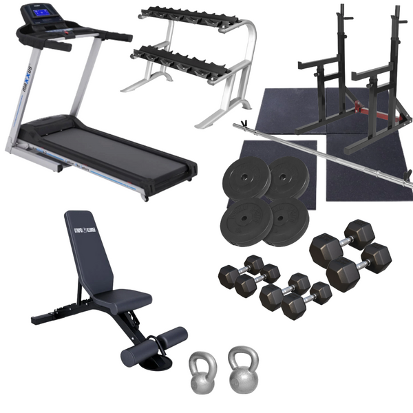 Stora hemmagymspaketet – Premium Med det här paketet får du allt du behöver för att träna styrka, kondition och funktionell träning hemma på ett säkert och effektivt sätt! Med Skivstångsställning med skivstång och vikter 30/50mm kan du enkelt träna knäböj, stående axelpress, bänkpress tillsammans med träningsbänken, stångrodd och dips. Den robusta konstruktionen och de justerbara safety racken gör att du kan lyfta tungt utan att behöva oroa dig för säkerheten. Om du kombinerar ställningen med Träningsbänk 400 Justerbar Ställbar kan du göra bänkpress och andra pressövningar, samtidigt som Hexagonhantlar PREMIUM, Kettlebell Massive IRON och Löpband MAXXUS 4.2i ger dig både styrka, kondition och funktionell träning. Träningsgolvet Gymgolv Gymmatta Set 4 skyddar golvet, minskar ljud och ger stabilitet vid tyngre lyft. Paketet innehåller; Löpband MAXXUS 4.2i – Löpband med löpyta 125x44cm, upp till 16km/h, 12% lutning, multifunktionsskärm med blå belysning, POLAR®-kompatibel pulsmottagare och hopfällbar för platsbesparing. Träningsbänk 400 Justerbar Ställbar – Stabil bänk med justerbart rygg- och sittstöd, maxbelastning 400kg, PU-läder och massivt stål, enkel att placera i hemmagymmet. Skivstångsställning med skivstång och vikter 30/50mm – Robust skivstångsställning med justerbara safety racks, möjlighet att utföra knäböj, dips, stångrodd, axelpress och bicepscurls, skivstångar 30mm och 50mm samt BASIC-viktskivor på totalt 30kg. Hexagonhantlar PREMIUM 2x10kg, 2×12,5kg, 2x20kg – Robust hantlar med gummibeläggning, ergonomiskt handtag, stabil botten och tydlig viktmarkering, perfekt för styrketräning av både stora och små muskelgrupper. Kettlebell Massive IRON 4kg & 12kg – Gjuten kettlebell med plan botten och viktmarkering, gjuten i ett stycke vilket gör dem lämpliga för både nybörjare och professionella. Hantelställning PRO Universal – Håll ordning på upp till fem par hantlar, maxbelastning 250kg, robust stålkonstruktion med gummifack. Träningsgolv Gymgolv Gymmatta Set 4 – Fyra halkfria kvadrater på 50x50x2cm, gummi med antislip, skyddar golvet och absorberar ljud. Löpband MAXXUS 4.2i Dimensioner utfälld (LxBxH); 165x74x130cm Dimensioner hopfälld (LxBxH); 112,5x74x130cm Maximal belastning; 110kg Hastighet; Upp till 16km/h Lutning; Upp till 12% Motorns effekt; 1,75hk Löpyta; 125x44cm Hopfällbar Vikt; 61,5kg Träningsbänk 400 Justerbar Ställbar Mått totalt (LxBxH); 156x51x114cm Mått sittdyna (LxBxH); 35,5x40x5cm Mått ryggdyna (LxBxH); 81x30x5cm Material dyna; Skum, PU-läder Material stomme; Massivt stål Maximal belastning; 400kg Ryggdyna justerbar; 8-vägs Sittdyna justerbar; 3-vägs Färg; Svart, vita sömmar Höjd sittdyna; 43cm Handtag och hjul Vikt; 18,9kg Skivstångsställning med skivstång och vikter 30/50mm Skivstång längd och vikt 170cm och 10kg, viktskivor 2x5kg och 2x10kg, totalt 30kg, två fjäderlås ingår Mått totalt (BxDxH); 72,5-115x95x103-163cm Justerbar höjd safety racks; 63-93cm Maximal belastning safety racks; 280kg Justerbar höjd rack; 91-151cm Maximal belastning rack; 300kg Maximal belastning dips; 160kg Längd säkerhetsplan; 49cm Vikt; 27kg Hexagonhantlar PREMIUM 2x10kg, 2×12,5kg, 2x15kg Material; Gjutjärn och gummi Handtagslängd; 13cm Tydlig viktmarkering Färg; Svart Kettlebell Massive IRON 8kg & 12kg Material; Gjutjärn Färg; Silver/Grå Viktmarkering Hantelställning PRO Universal Lämplig för hantlar med en inre handtagslängd på 13cm eller mer Tillverkad av stålrör; 80x40mm Mått (LxBxH); 121x65x100cm Maximal belastning; 250kg Plats för fem par hantlar Färg; Silver Träningsgolv Gymgolv Gymmatta Set 4 Vikt; 18kg totalt, 4,5kg per kvadrat Mått (LxBxH); 50x50x2cm Färg; Svart med vita prickar Maximal belastning; 1000kg Material; Gummi, antislip Antal; Fyra kvadrater Det här paketet är perfekt för dig som vill bygga ett komplett hemmagym med utrustning för styrka, kondition och funktionell träning på ett säkert och platsbesparande sätt.